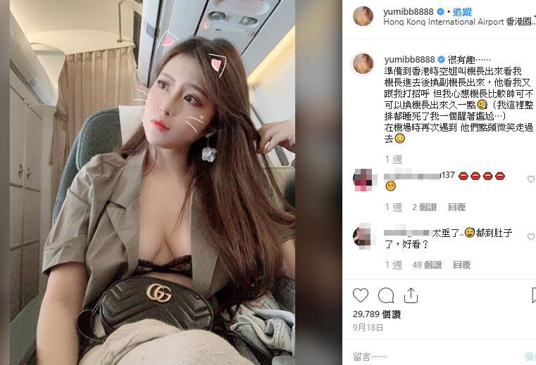 Yumi將機上奇遇公開到個人IG立刻引起網友歪樓表示「這樣露法小心飛機出事」、「這可以幫機長提振精神吧」、「機長什麼空姐沒看過,應該是你穿的太特別了」,但也有網友針對Yumi身材說到「太養眼」、「你中洞大開」、「太垂了,都到肚子了好看嗎」。