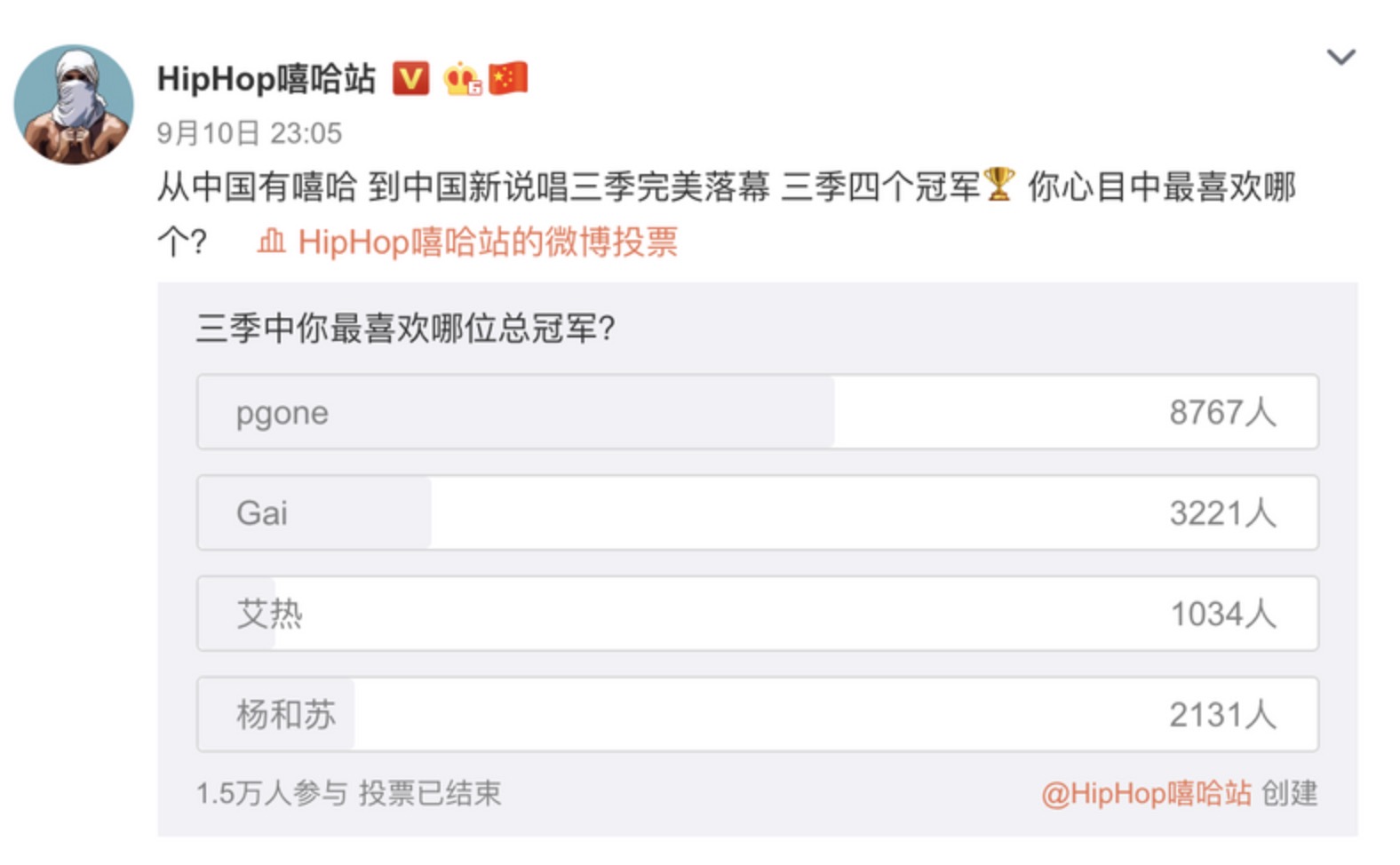 愛奇藝在2017年時推出自製節目《中國有嘻哈》廣受好評,除了賽制相當豐富之外,導師陣容也非常華麗,包含:熱狗、張震嶽、吳亦凡以及潘瑋柏組成三組戰隊,節目也讓許多說唱好手打開知名度,像是:Jony J、VAVA、艾福杰尼等人,而在第一季節目中也出現相當驚奇的事,在總冠軍賽中誕生了兩位冠軍:PGONE以及GAI,近日,在微博上發起了三屆冠軍的實力、人氣投票,最高票與最低票相差8倍之多,引發熱議。