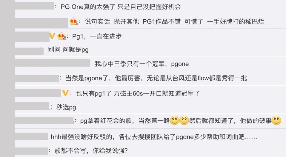 而得票數最高的PGONE獲得了8767張票,和第四名的艾熱相差8倍,在底下的留言區中大部分網友們稱讚PGONE:「我心中三季只有一個冠軍,pgone」、「別問 問就是pg」、「Pg1,一直在進步」、「pgone 還用問嗎」,也有少部分的人認為PGONE很多都是靠著紅花會成員「貝貝」寫的詞。也有許多人感嘆PGONE雖然擁有過人的實力,但是因為在2017年年底時發生「夜宿門事件」,外加上許多負面消息導致他被封殺了近2年,近期回歸歌壇也推出多首單曲並且展開巡迴演出。