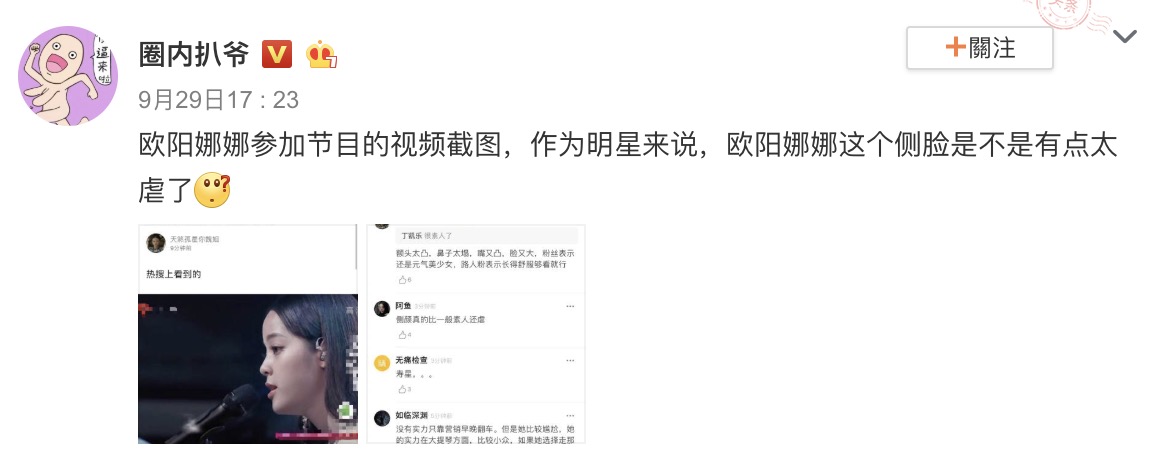 然而在歐陽娜娜陶醉的演唱歌曲時,鏡頭多次照到歐陽娜娜側臉的特寫,就有許多知名娛樂博主在微博上發文討論歐陽娜娜的側臉,寫下:「歐陽娜娜參加節目的視頻截圖,作為明星來說,歐陽娜娜這個側臉是不是有點太虐了」,網友也紛紛表示:「額頭太凸、鼻子太塌、嘴又凸臉又大」、「側臉真的比一般素人還虐」,但許多網友也替歐陽娜娜平反:「她夠漂亮的了,而且有辨識度,現在很多人的臉看了記不住啊」、「但是看著很舒服 雖然不那麼精緻 但好在有特點 在娛樂圈有特點難道不是更重要嗎」,認為歐陽娜娜的外型已經非常漂亮了。