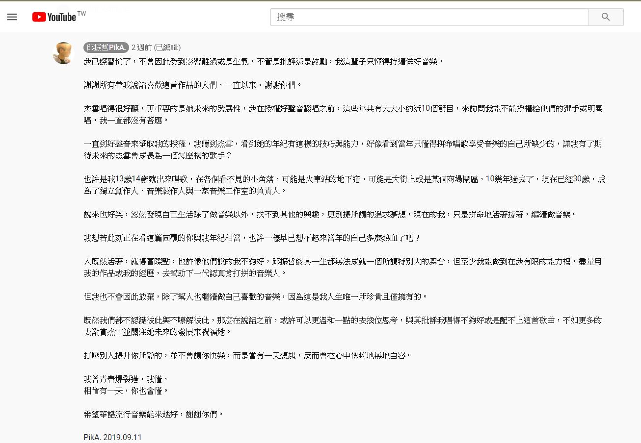 在面對這一波的爆紅旋風,原唱「邱振哲」也出面做出了回應,「邱振哲」直言「我已經習慣了,不會因此受到影響難過或是生氣,不管是批評還是鼓勵,我這輩子只懂得持續做好」,更一一細數自己這一路以來的心路歷程,也提及了當初之所以會授權歌曲的緣由,文字間充滿了對於選手馬杰雪的惜才之心,最後他更真情流露地表示「我也不會因此放棄,除了幫人也繼續做自己喜歡的音樂,因為這是我人生唯一所珍貴且僅擁有的。」,字字句句皆帶著他如歌曲般的溫暖氣息。