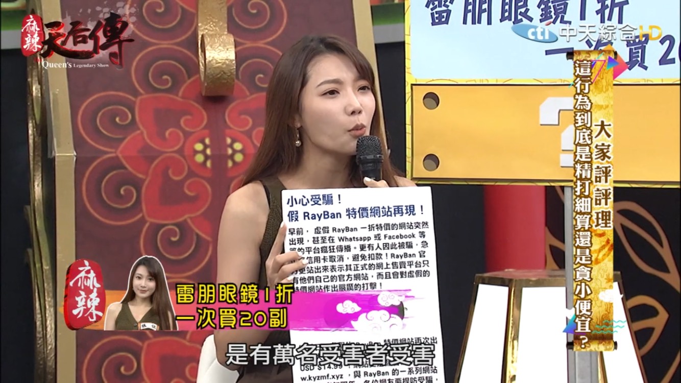 近日,依依錄製《麻辣天后傳》時透露自己購物上當受騙的經驗,她表示,自己有次睡前發現自己追蹤很久的Instagram帳號突然大拍賣:「雷朋官方網站現在限時特價1折」,因為帳號追蹤人數多,讓依依認為應該不是詐騙,而且怕商品很快地被搶購一空,所以依依未經求證就馬上下單,一口氣買了20副,替爸爸、媽媽和妹妹都買了,一共花了2萬元。