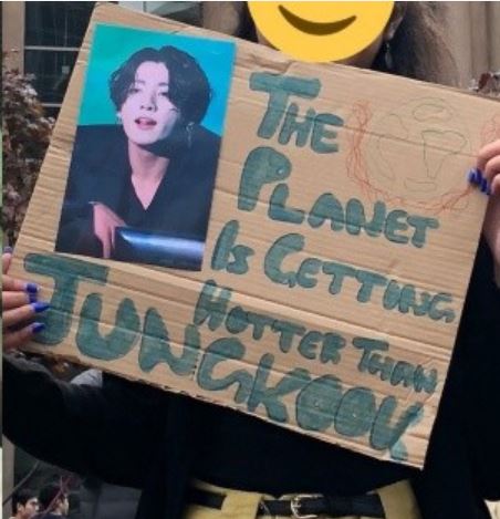 近日,有一場反全球暖化的遊行在加拿大舉辦,現場有一位女粉絲,手上高舉一張標語,紙板上面貼有防彈少年團成員柾國的照片。女孩在標語上表示:「地球已經比柾國還要火熱(HOT)了。」用幽默詼諧的方式稱讚了柾國的性感,也表達出自己對於氣候變遷的無奈和憤怒,逗趣的表達方式,讓這張照片在網上造成瘋傳。