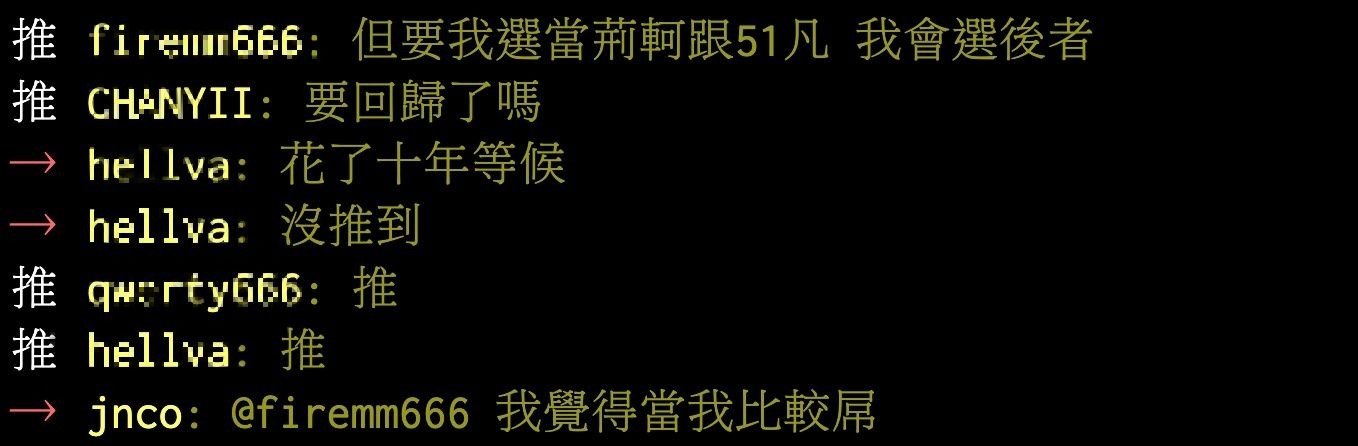 睽違許久才回歸的荊軻在PTT嘻哈版上也引起討論,就有網友留言:「但要我選當荊軻跟51凡 我會選後者」,意外釣出荊軻本人回應:「我覺得當我比較屌」,該則留言也不斷被網友朝聖。