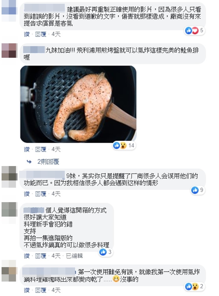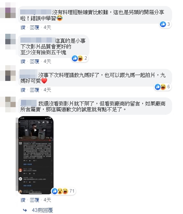 Joeman道歉聲明一出,引來不少網友留言,「沒有料理經驗確實比較難,這也是另類的開箱分享啦!錯誤中學習」、「其實這種錯誤剛好反映很多使用者,尤其是料理白癡會發生的現象」、「弄成不正常料理勿學,再用一個正常料理補回來!」