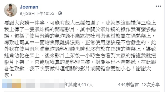 該影片上傳約一小時,受到指責的Joeman便將影片下架,26號Joeman也出面承認自己操作上有誤,自嘲是「料理白癡」,同時也向大家致歉,「只能說我真的是料理白癡,對產品也不夠熟悉,在此跟各位致歉,我下次要做料理相關的影片或開箱會更加小心!謝謝大家。」