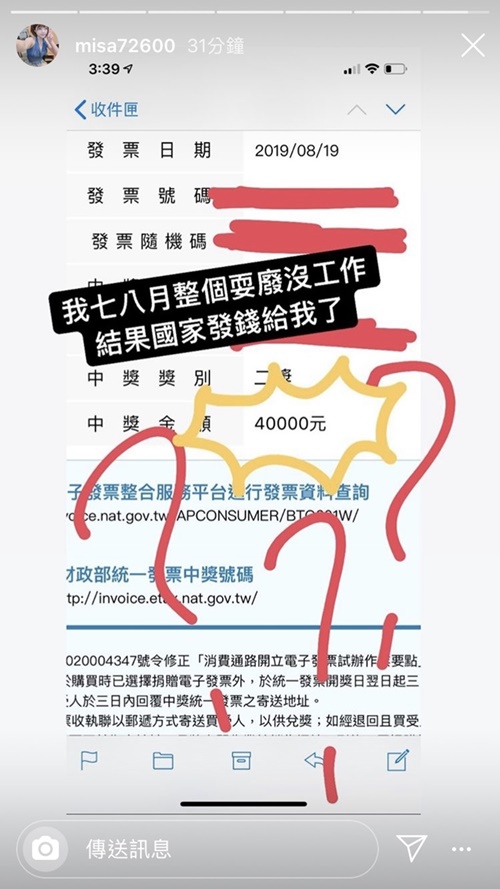 米砂1日下午在限時動態中分享一張照片,內容是「發票中獎」的通知,其中可以看到,米砂竟中了二獎,獎金高達4萬元,米砂也在圖中幽默地表示,「我七八月整個耍廢沒工作,結果國家發錢給我了!」