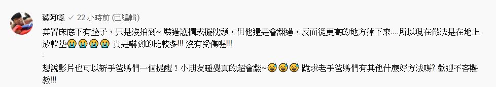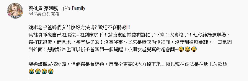 上傳影片的同時,蔡阿嘎也解釋蔡桃貴沒有受傷:「其實床底下有墊子,只是沒拍到~裝過護欄或擺枕頭,但他還是會翻過,反而從更高的地方掉下來....所以現在做法是在地上放軟墊」,並透露因為小孩睡覺時常翻身,所以發布影片提醒新手爸媽們。除此之外,蔡阿嘎也透過網路向網友請教:「跪求老手爸媽們有什麼好方法嗎?歡迎不吝賜教!」