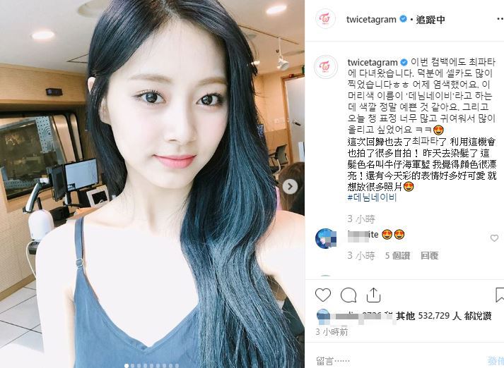 TWICE近期以第8張迷你專輯《FEEL SPECIAL》回歸,也為新作品勤跑宣傳,雖然行程滿檔,不過成員子瑜也趁空在上月30日到髮廊染髮,從金髮染身成牛仔海軍藍。從IG中可見,子瑜當天身穿V領藍色背心小露性感同時也襯托她的白皙肌膚,而頭髮則從回歸時的金髮變成牛仔海軍藍,子瑜臉上還掛著淺淺的微笑看似相當滿意新造型,同時也自信表示「我覺得顏色很漂亮」。