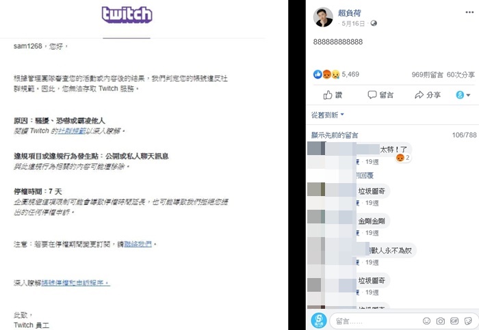 事實上,今年5月超負荷才被BAN台,當時官方回應超負荷表示,因違反社群規範「騷擾、恐嚇或霸凌他人」,所以停權7天。5月的停權事件引起網友騷動紛紛開罵「垃圾圖奇」,如今超負荷再被BAN,更是讓網友開始質疑Twitch的停權標準。