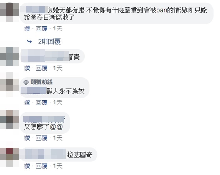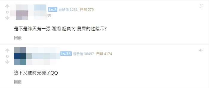 Ban台消息一出,立刻引來不少網友留言,「是不是昨天有一張湘湘超負荷鳥屎的性暗示?」、「這下又進時光機了QQ」、「怎麼一直在強制讓別人坐時光機」、「到底要BAN到什麼時候才爽」、「這幾天都有跟,不覺得有什麼嚴重到會被ban的情況啊!只能說圖奇日漸腐敗了」。