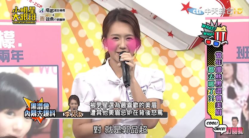 李又汝近日錄製綜藝節目《小明星大跟班》,透露,有次《我愛黑澀會》錄影時,郭品超受邀擔任嘉賓,當時因應節目橋段,郭品超必須選出一個「心目中最喜歡的美眉」,結果郭品超就選了李又汝,「我也很驚訝他會選我,選完之後我就覺得很開心」。錄影結束後,其他美眉紛紛上前和郭品超自拍,而李又汝先回到休息室換衣服,結果意外聽到美眉在背後講她的壞話,讓她十分難過。