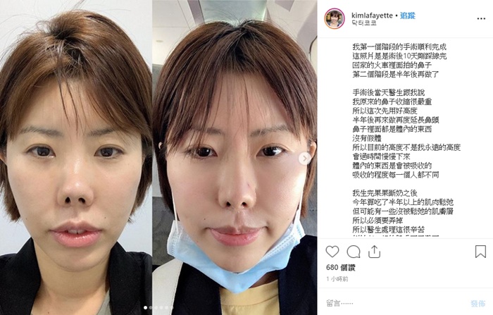 金老佛爺在IG上解釋,「原來的鼻子收縮很嚴重,所以這次先用好高度,半年後再延長鼻頭」,同時她也提到,術後鼻子內都是自體的東西,沒有假體,由於體內的東西會被吸收,因此目前的高度不是永恆,會隨著時間慢慢下來。金老佛爺也坦言,「對我來說自己想怎麼樣的鼻子不重要,只是處理掉現況我的豬鼻子,所以我也會聽醫生的話,繼續管理鼻子也繼續吃藥」。