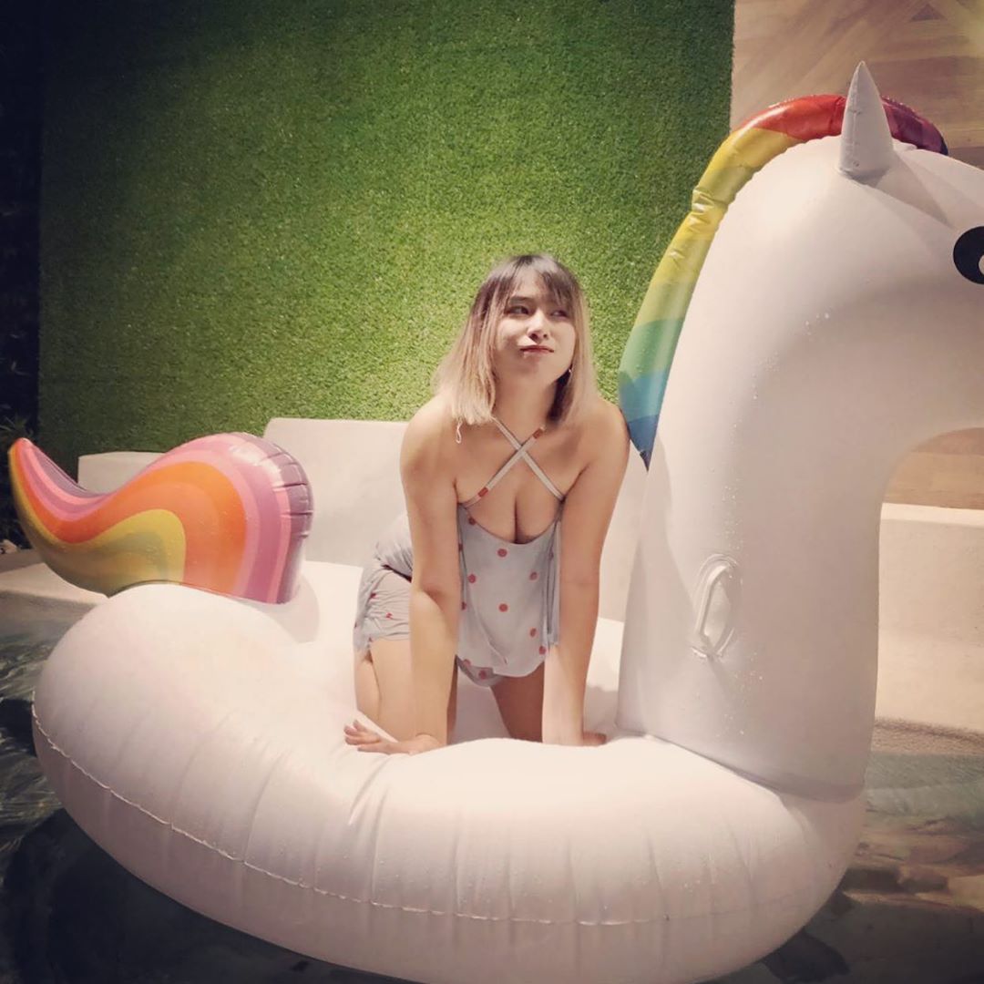 除了穿著之外,笑笑也在照片中大擺性感姿勢。照片中,笑笑眼睛看向別處,露出俏皮的笑容,看起來相當清純,與之相反的是,她跪坐在獨角獸造型的泳圈上,兩手往前放在泳圈上,藉此突顯出自己的渾圓的北半球,姿勢十分引人遐想。