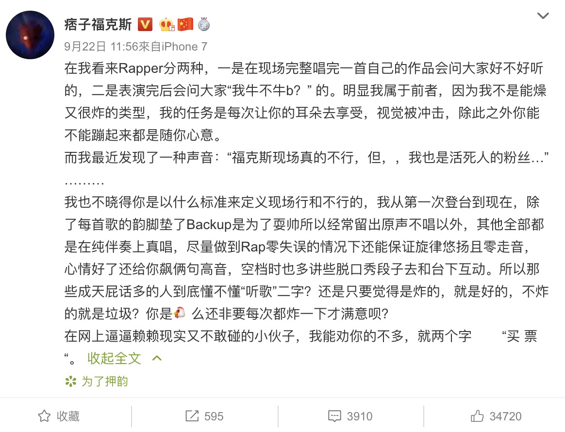 日前福克斯參加由愛奇藝打造的Live House Sho《刺蝟現場》時也獻唱招牌歌曲《慶功酒》,但在影片曝光後卻收到許多網友批評的聲浪,認為福克斯的現場演出很不穩,更有網友認為他是對嘴演出:「這現場真的不太行」、「屬實像喊麥」、「江郎才盡?每次都是這首」、「說實話聽多了感覺有點油膩了」,而福克斯本人也轉發影片回應:「我也不曉得你是以什麼標準來定義現場行和不行的,我從第一次登台到現在,除了每首歌的韻腳墊了Backup是為了耍帥所以經常留出原聲不唱以外,其他全部都是在純伴奏上真唱」,並表示自己演出都盡量做到Rap零失誤、零走音,最後更冷嗆鍵盤酸民們:「所以那些成天屁話多的人到底懂不懂『聽歌』二字?」,言詞之間傳遞出滿滿不悅的情緒。