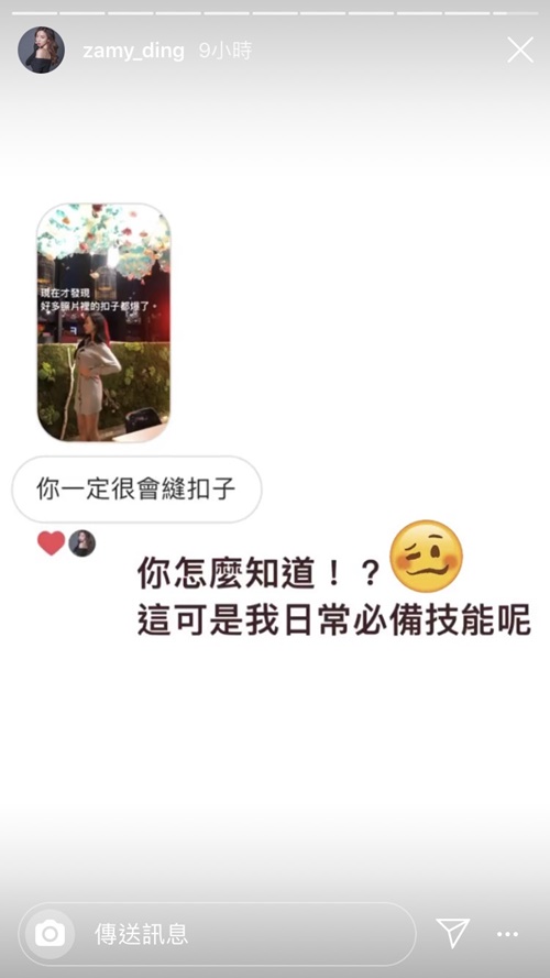 照片一出後,立刻有網友私訊開玩笑表示,「你一定很會縫扣子」。而奎丁也截圖分享到限時動態,同時寫下,「你怎麼知道?!這可是我日常必備技能呢」和粉絲一來一往的互動,十分有趣。