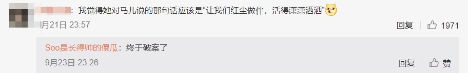 影片一播出,立刻引起廣大網友的共鳴。不少網友被影片中的片段逗樂,留言表示:「我把全家人都笑醒了啦!」、「笑到眼淚都出來」、「笑瘋了,我當年到底是怎麼看下去的」,也有網友發揮柯南精神,推理透露:「我覺得她對馬兒說的那句話應該是讓我們紅塵做伴,活得瀟瀟灑灑」、「是讓我們策馬奔騰,共用人世繁華」,逗樂不少網友。