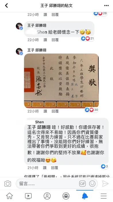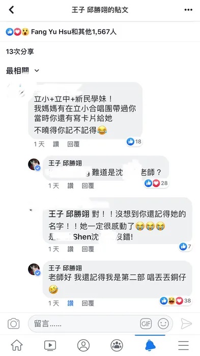 而合唱團老師的女兒也在跟王子認親之後,在Dcard上面發文跟大家分享王子的小時候與媽媽的回憶,她寫道:「身為他國小+國中+高中學妹的我,也有穿過同樣的制服站在同樣的地方拍過照!我媽曾經在王子讀的國小任職,當時擔任王子合唱團的老師,王子以前是第二部,要在無伴奏唱第二部很厲害!只是很不幸的在王子六年級時,我爸爸癌症復發,媽媽每天都是醫院學校奔波,當時王子還會去看看我媽的車在不在!」