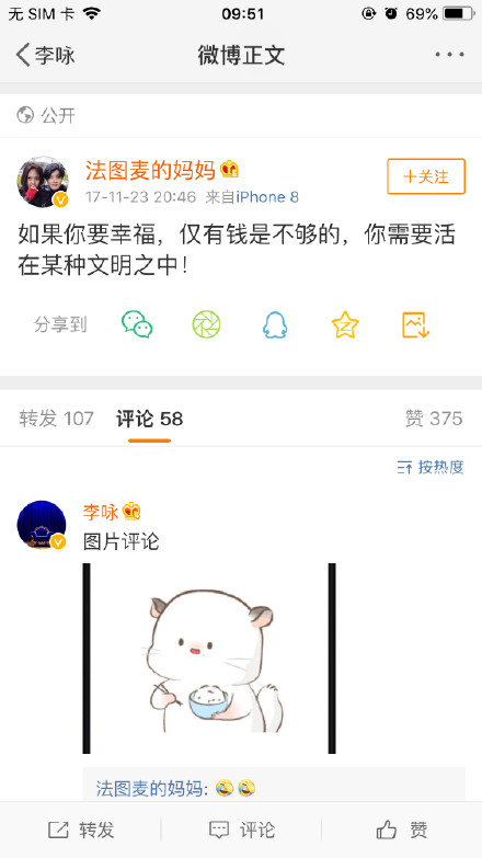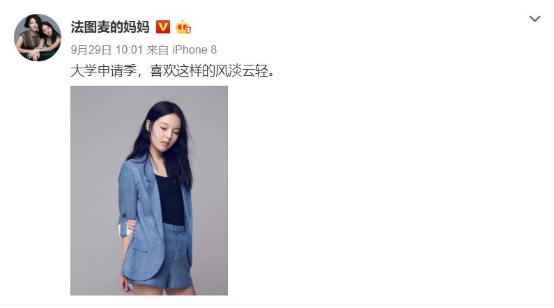 9月底時,哈文在微博上表示:「大學申請季,喜歡這樣的雲淡風輕」,並附上一張法圖麥的照片。照片中,法圖麥已經出落得相當亭亭玉立,她身穿一件簡單的黑色T恤,外搭一件藍色西裝外套,下半身則搭配一件同色系的丹寧短褲。現年17歲的法圖麥不僅有張小巧的鵝蛋臉,身材更是相當纖細,氣質也十分出眾。