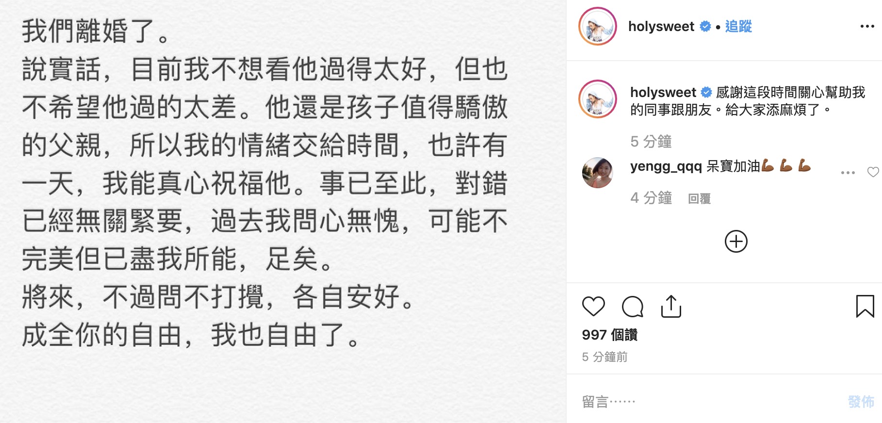 今日(3)呆寶靜在IG上發文宣布兩人離婚:「我們離婚了。說實話我不想看他過得太好,但也不希望他過得太差」,也提到小春是孩子值得驕傲的父親,也許有一天她能夠真心的祝福他,呆寶靜也表示:「事已至此,對錯已無關緊要,過去我問心無愧,可能不完美但已盡我所能,足矣」,最後文末也寫道:「成全你的自由,我也自由了」。
