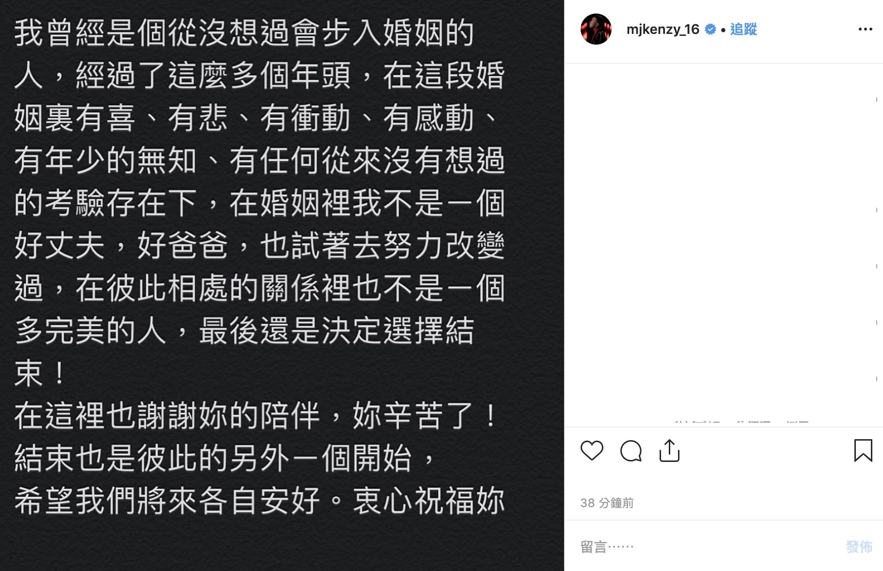 小春今日(3)中午也發文,圖片裡寫著:「我曾經是個從沒想過會步入婚姻的人,經過了這麼多個年頭,在這段婚姻裡有喜、有悲、有衝動、有感動、有年少的無知、有任何從來沒有想過的考驗存在下,在婚姻裡我不是個好丈夫、好爸爸」,也提到曾試著改變但最終還是決定要結束這段婚姻,文末也對呆寶靜致謝:「在這裡也謝謝妳的陪伴,妳辛苦了!」,也獻上祝福。