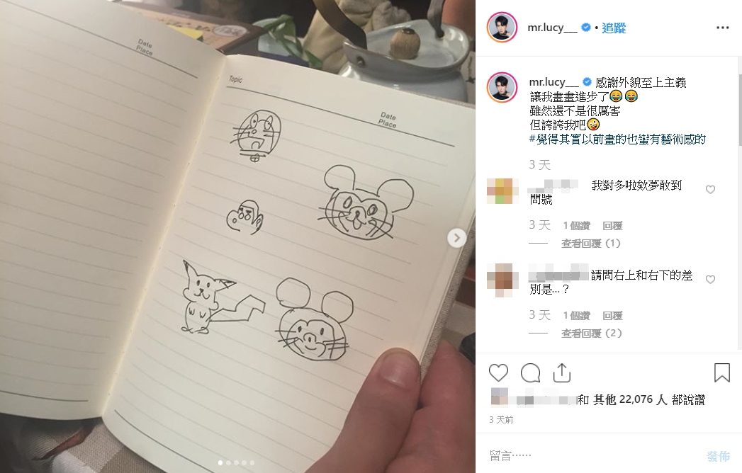 此外,李玉璽也在IG上發文展現自己可愛、逗趣的一面,「雖然還不是很厲害,但誇誇我吧」,並笑說:「覺得其實以前畫的也蠻有藝術感的」,逗樂一群粉絲,也讓粉絲忍不住打趣笑說:「第一張到底是什麼小朋友的畫畫?」、「從三歲的作品進步到三十歲啦哈哈哈哈」。