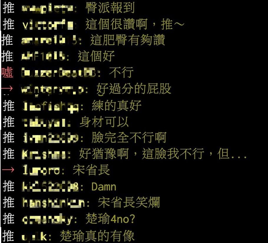 然而PTT鄉民們看見Esther Bae性感的照片後,紛紛在留言區中說道:「好過分的屁股」、「這個好」、「這肥臀有夠讚」、「臀派報到」、「這個很讚啊,推~」,更有網友歪樓表示Esther Bae撞臉台灣政治人物「宋楚瑜」,表示:「宋省長笑爛」、「宋省長」、「臉完全不行啊」、「楚瑜真的有像」,也有人認為她很像阿雅(柳翰雅)、王淨,驚人的身材在PTT表特版中掀起一陣熱烈討論。
