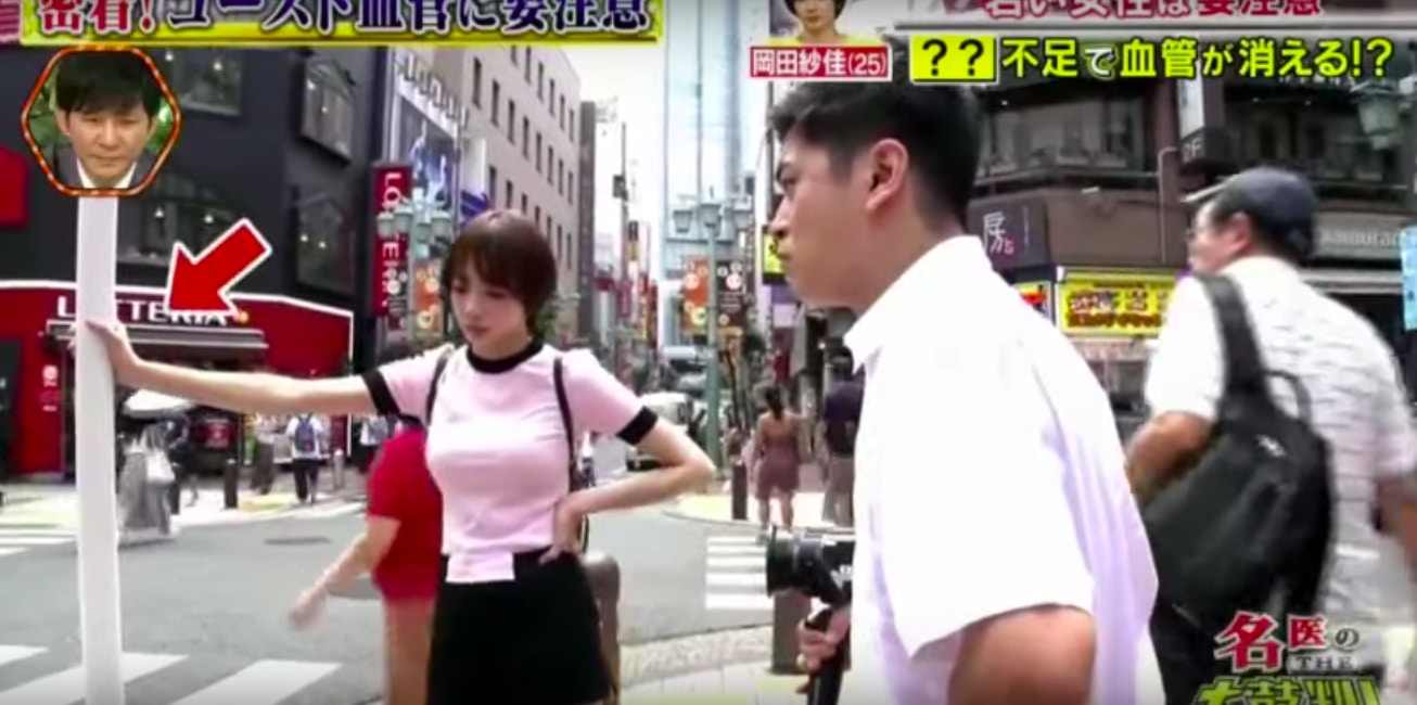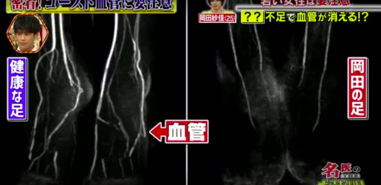 日本TBS電視台播放的綜藝節目《名醫のTHE太鼓判(名醫掛保證)》,時常聘請許多知名醫生上節目教導觀眾正確的健康常識,並討論普遍國人們擔心的身體疾病。近日,一位名叫岡田紗佳的模特兒因出現不能久站的症狀,而節目尋求醫生的幫忙,醫生得知她在家中的「豪放」坐姿後,證實了她的小腿血管萎縮、產生肌肉無力的事實。
