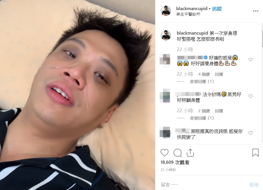 雖然狀況不佳,但是黑男也不忘搞笑本色,在IG上表示:「第一次穿鼻環,好緊張喔,怎麼那麼長啦」,在影片中也逗趣表示:「誰知道打鼻環會這麼痛,想說很Fashion,三個月不能拔」,更打趣透露自己今天要這樣去拍片。搞笑之餘,在影片最後,黑男還是向粉絲允諾:「我會加油的」。