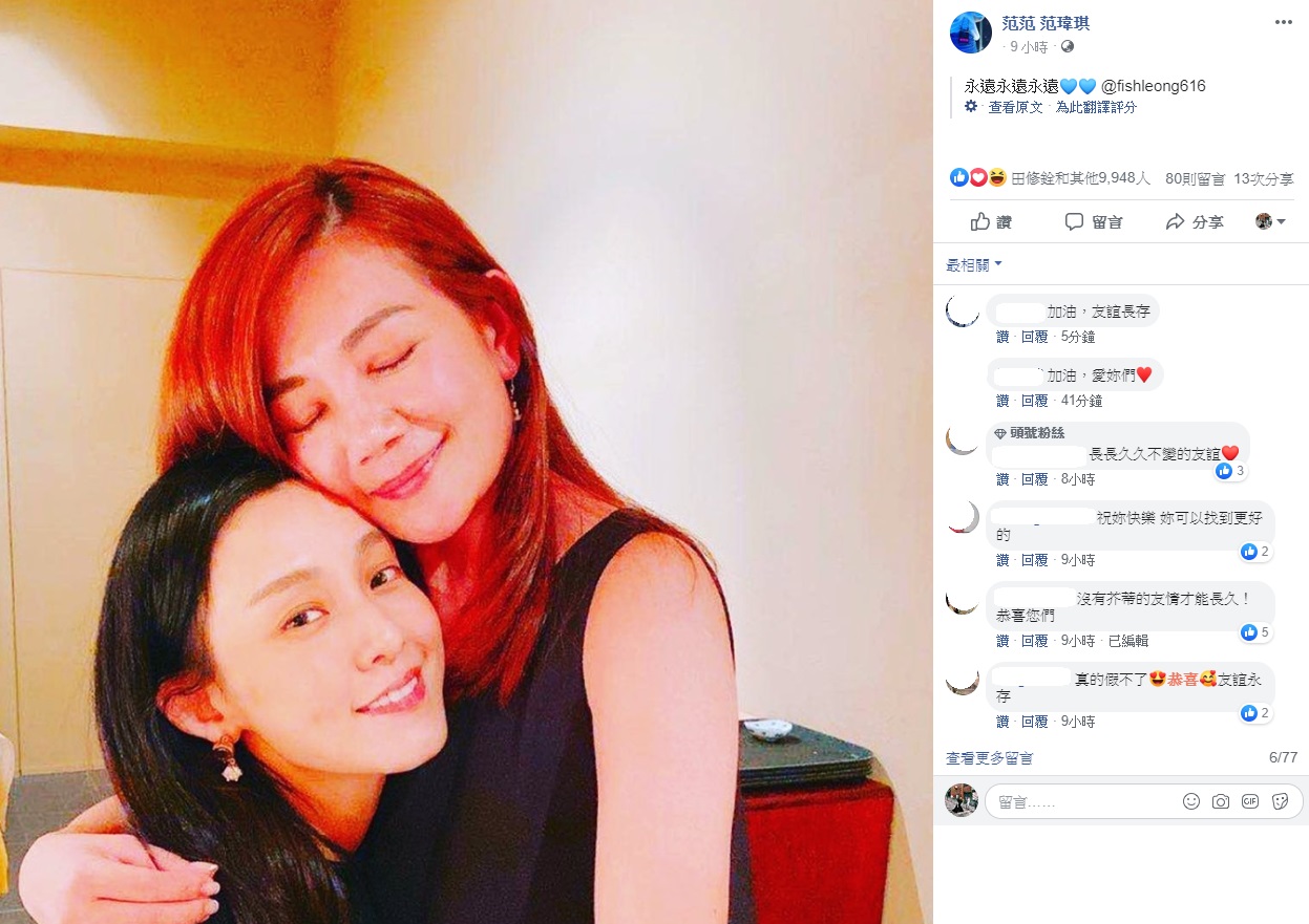 其他粉絲看到之後,也紛紛留言表示,「沒有芥蒂的友情才能長久!」、「不因流言蜚語攻擊的友情才是真友誼」、「身為公眾人物真的很辛苦,范范加油」、「友誼歷久ㄧ樣濃」、「屌打一堆酸民」、「范范不是那種有心機的人,只是太善良不會說謊話,結果被弄到好像她很壞一樣!」。
