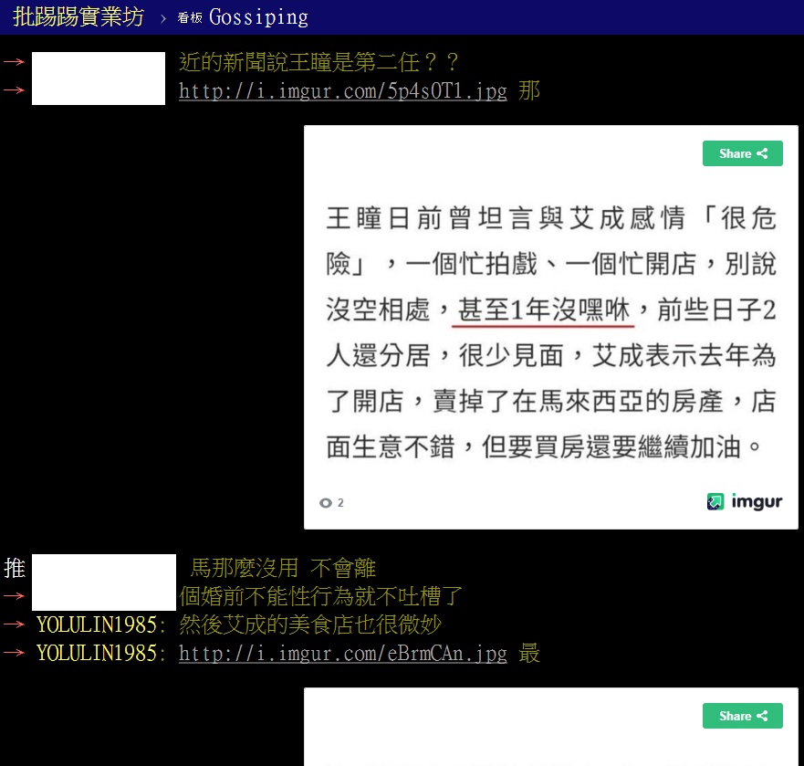 事後網友們也紛紛在網路上熱烈討論,其中有網友指出「之前艾成說自己28歲交過4任女友,馬來西亞男生很保守,婚前不能有性行為,但怎麼後來又說王瞳是第二任女友呢?而且還是加入教會之後,才維持了一年的『無性生活』?」其他網友看完也一頭霧水,完全不懂現在是不是在演番外篇,紛紛留言,「交往這麼多年,艾成該滿足了!」、「艾成知道王瞳的事情後的反應真的超另類」、「我比較好奇艾成到底交幾任女友」、「渣翔就是如此!男的爽完沒事,女的慘」。