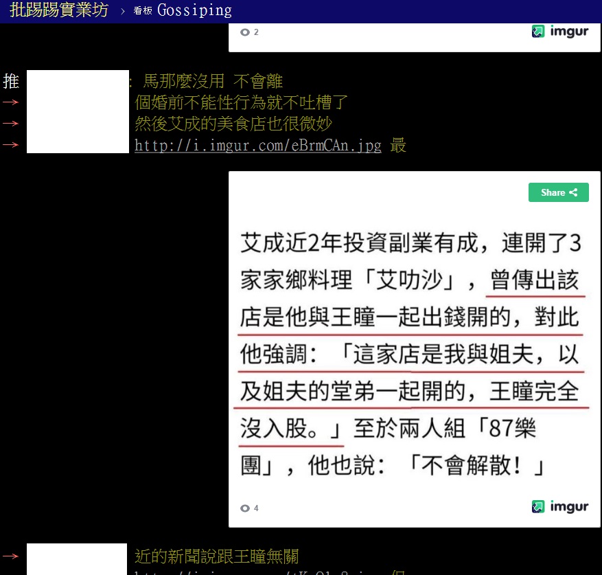 而且之前王瞳和艾成兩人一同上《一袋女王》錄影時,王瞳曾提過,「二店是艾成自己出錢,自己目前只有投資西門町的店,2人齊心為結婚而努力,希望早點通過媽媽的考驗」。也算是給網友們一個清楚的交代,並不像大家所說的投資各半那樣!艾成也說,「現在這家新的店是自己跟姊夫,還有姊夫的堂弟一起開,王瞳完全沒入股」。
