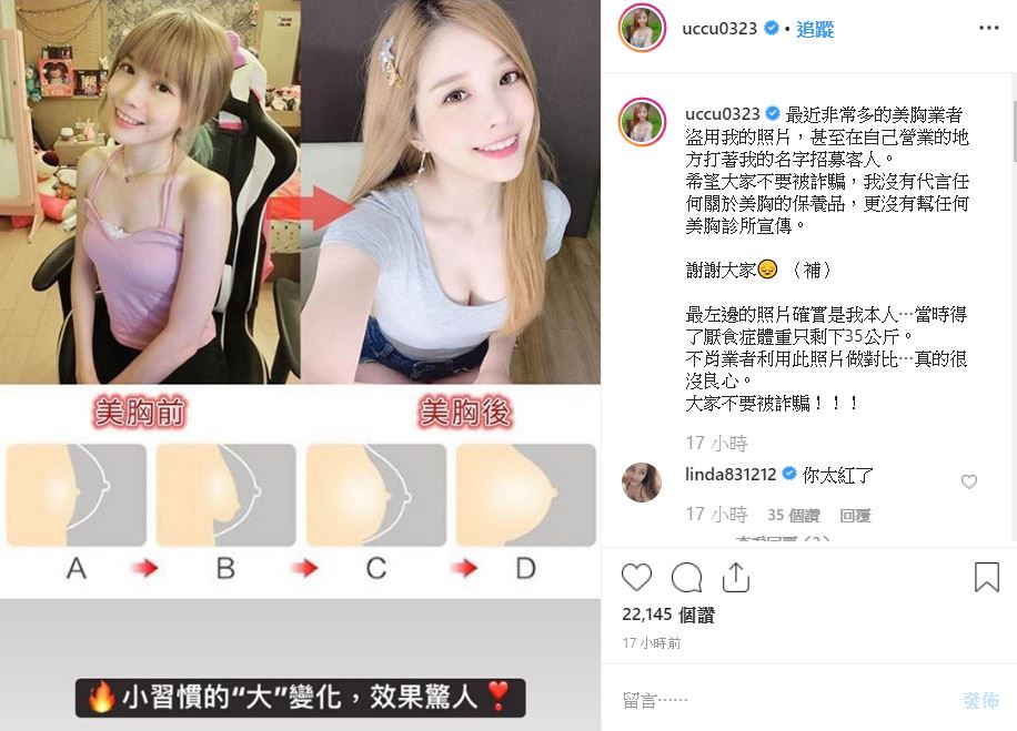 網紅「瑀熙」過去從英雄聯盟實況主起家,在網路上小有名氣。近幾年瑀熙轉戰Youtube,開設個人頻道「瑀熙Yuci」,影片內容以旅遊Vlog、開箱、談話等系列影片為主。甜美的外型和自然大方的個性讓瑀熙深受粉絲喜愛,目前頻道已經擁有超過45萬粉絲訂閱。近日,瑀熙發文透露,有不肖業者盜用她的照片,也證實照片中平胸的女主角確實是自己!