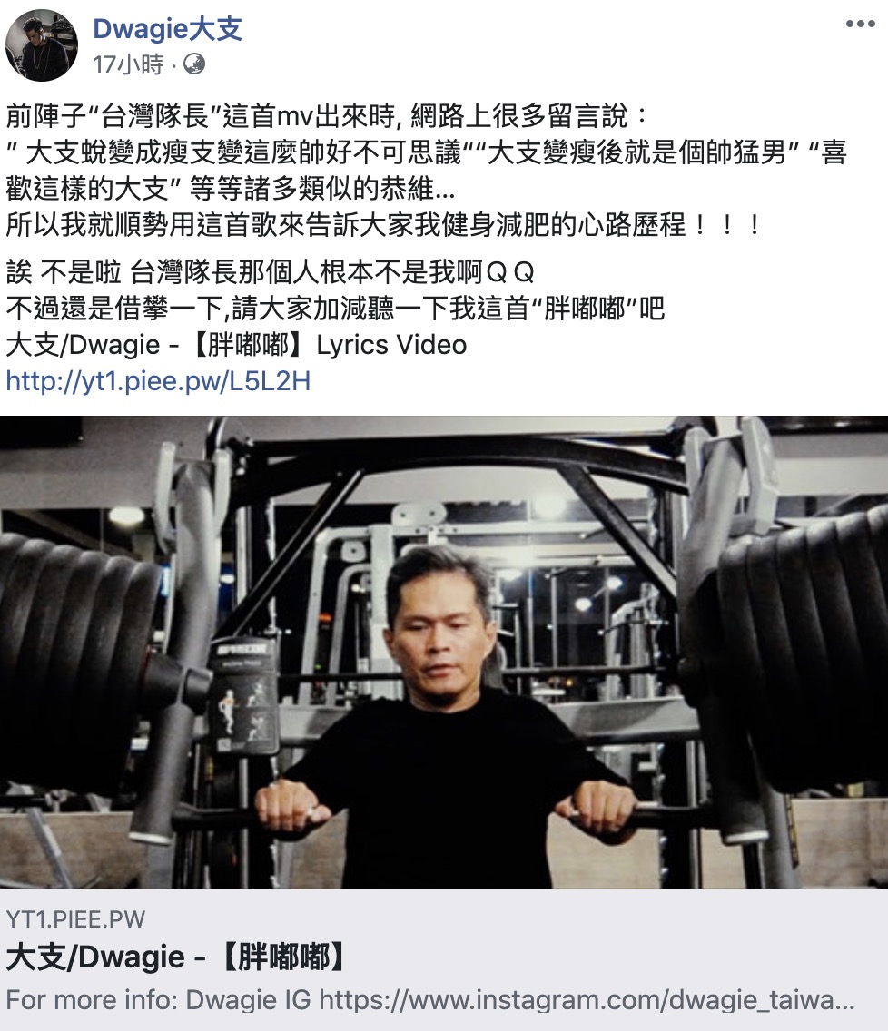 日前大支替總統操刀製作競選歌曲《台灣隊長》,在MV裡大支明顯與之前瘦了許多,也獲得網友們大力稱讚。在昨日他推出新歌《胖嘟嘟》的MV,他也在臉書發文寫下:「 網路上很多留言說:『大支蛻變成瘦支變這麼帥好不可思議』、『大支變瘦後就是個帥猛男』、『喜歡這樣的大支』等等諸多類似的恭維…所以我就順勢用這首歌來告訴大家我健身減肥的心路歷程!」,在歌曲一開頭就說道「你這肥豬,禁止餵食」,MV也拍攝了大支在健身房時努力運動的模樣。