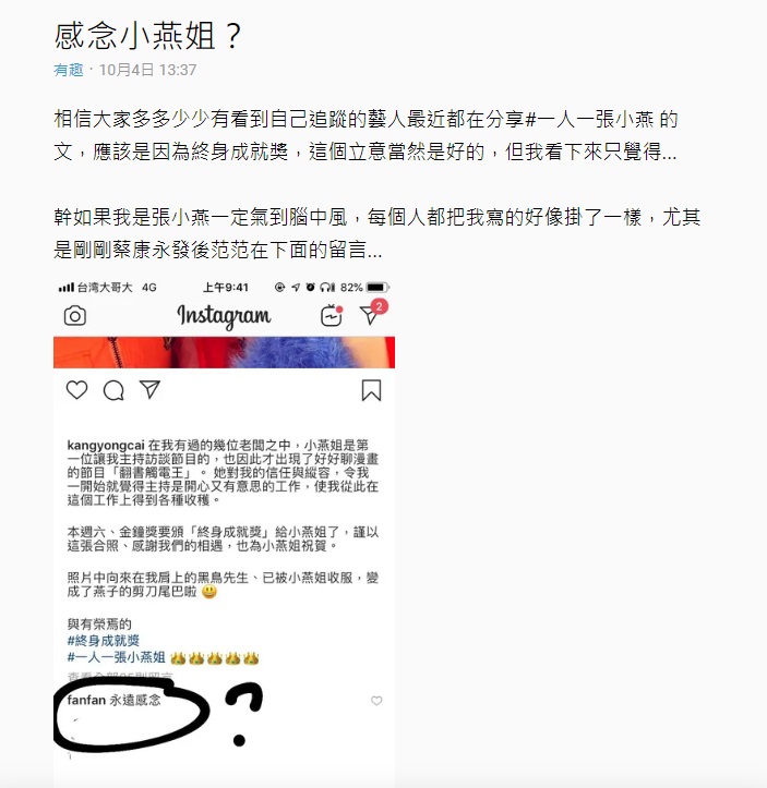 不過近日就有網友在Dcard上發文寫道,「看到自己追蹤的藝人最近都在分享#一人一張小燕的文,應該是因為終身成就獎,這個立意當然是好的,但我看下來只覺得......,如果我是張小燕,一定氣到腦中風,大家把我寫得好像掛了一樣!」而且網友還超級眼尖,發現在蔡康永的貼文下方,有著相當不尋常的留言!