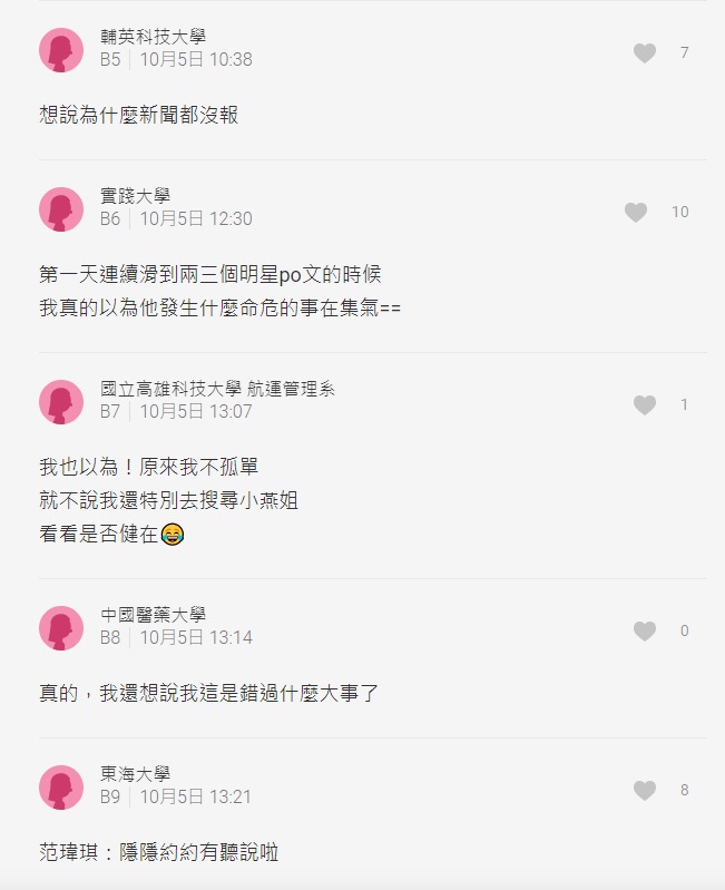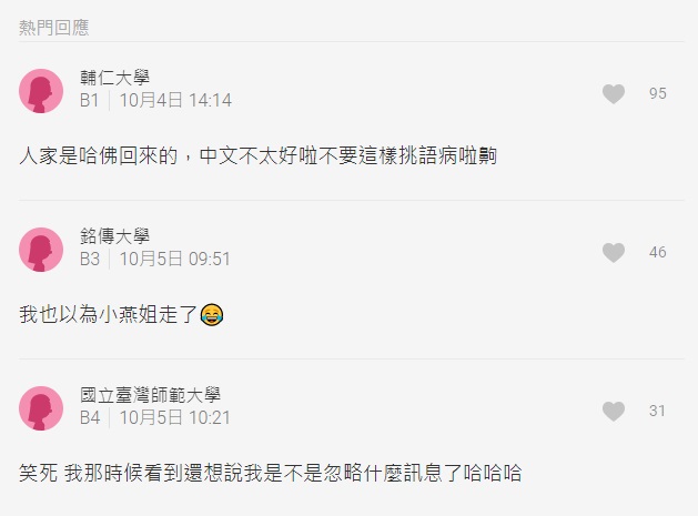 其他網友看完也都留言表示,「人家是哈佛回來的,中文不太好啦不要這樣挑語病啦齁」、「我也以為小燕姐走了」、「笑死,我那時候看到還想說我是不是忽略什麼訊息了哈哈哈」、「想說為什麼新聞都沒報」、「我真的以為他發生什麼命危的事在集氣」、「我也以為!原來我不孤單,就不說我還特別去搜尋小燕姐,看看是否健在」、「范瑋琪:隱隱約約有聽說啦」。