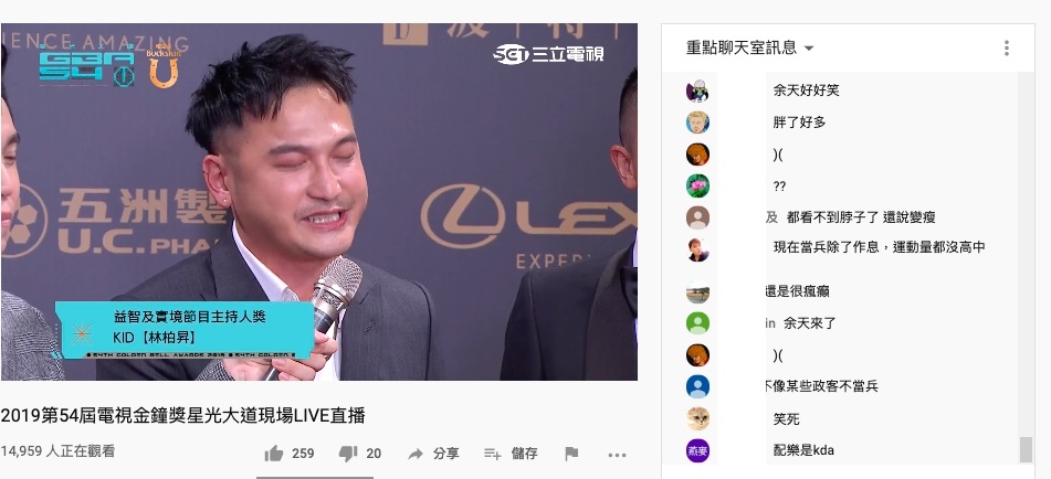 後來又被問「怎麼今天這麼像余天?」Kid又回,「不是今天是每天,余天大哥是個帥哥,我覺得今天是惡作劇,我好不容易請假,你們這樣對嗎!」也提到「軍中很少看到女生,今天紅毯很多深V~,並且大讚Sandy很漂亮、變很瘦」。