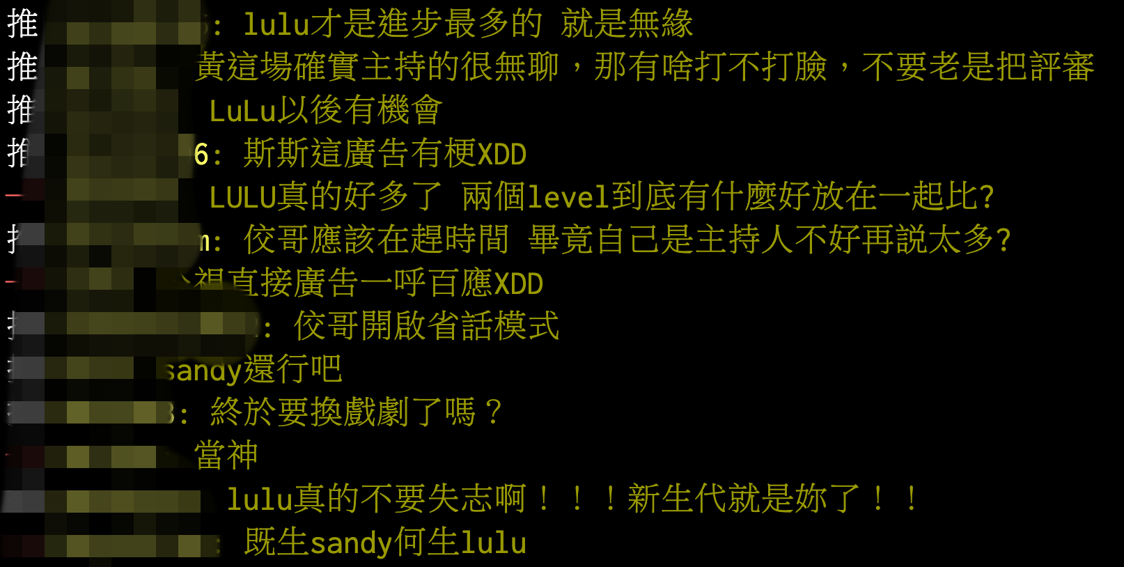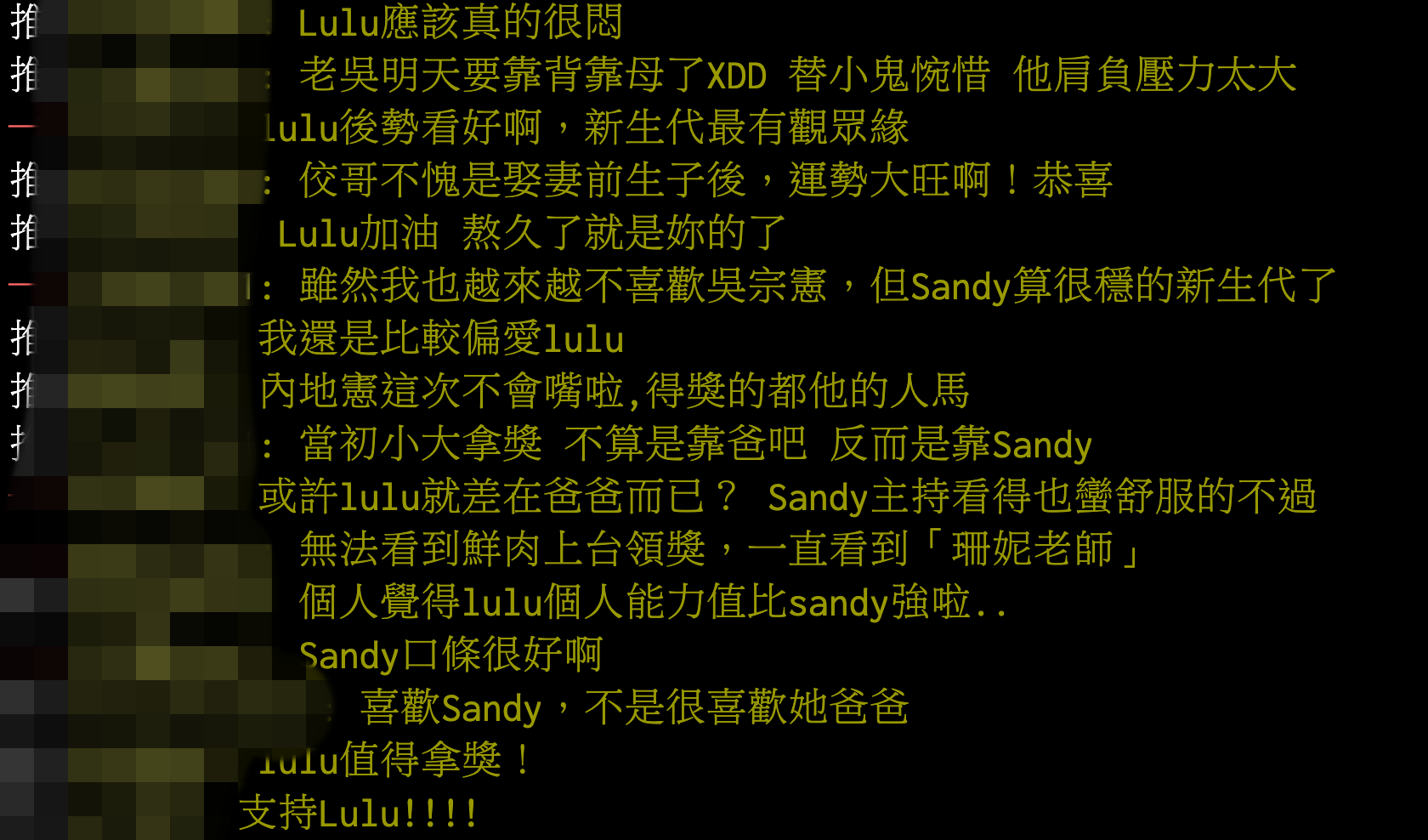 然而此次公布得獎結果綜藝節目主持人獎最後是由《一呼百應》的Sandy和黃子佼奪得,而本來就被外界笑稱有「瑜亮情節」的LULU已經第5度入圍金鐘獎,前3年都無緣奪獎,這次再度無緣金鐘,網友都表示「既生LULU何生Sandy」,同時也認定LULU的主持功力早就不再話下。