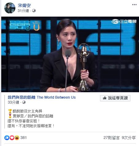 而當時劇迷為各角色在臉書成立的粉絲專頁也一一發文慶賀,首先是飾演受害者家屬的宋喬安就分享了奪下「最佳女主角」的畫面,而應思悅也同樣發文說到「謝謝曾沛慈」突然發文讓不少戲迷又驚又喜,十分有趣。