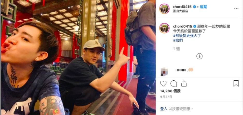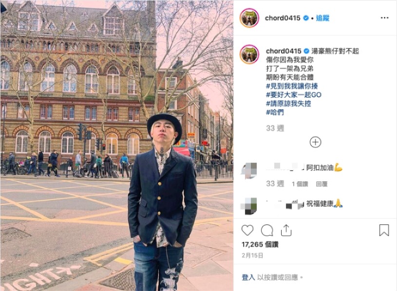 在網友們還一頭霧水、狀況外的猜測兩人到底發生什麼衝突時,今年2月時,阿扣再於IG發文,分別向周湯豪、熊仔致歉,除了感性喊話:「傷你因為我愛你」,更真性情道歉:「見到我我讓你揍、請原諒我失控。」