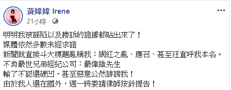 黃媁媁也在4日晚間也在臉書寫下,「媁哥不被惡勢力打敗!不起訴大勝利,民事接著要判,懇請大家幫我集氣」。許多粉絲紛紛在下面留言,直言「加油!」、「我只能說選經紀公司,一定要好好調查一番」、「還有要挑大型媒體公司,值得參考詢問!」