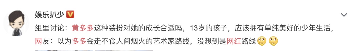 昨日(6)陸媒發佈了一系列黃磊一家人現身機場的照片,大女兒多多一路緊牽著爸爸的手,當天她身穿一件全黑的素T並配上牛仔長褲,頭上戴了一頂黑色的編織帽並配上一副豹紋框墨鏡,唇上也擦了紅色的唇膏,看起來相當有型。其中多多的髮色從原先的黑髮變為淺金髮,也引起網友兩極的討論,一派的人認為多多的風格越來越像網紅,且一直染頭髮很傷髮質:「發育中就化妝將來皮膚肯定不好」、「這個年齡階段,是不是不太合適?」、「黃多多很漂亮,但是不喜歡不天然的美」。