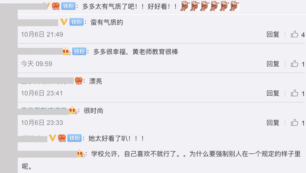 但也有許多網友認為黃磊和孫莉的教育方式很棒,也對多多的打扮讚譽有加:「多多太有氣質了吧!!好好看!」、「她太好看了吧!!」、「學校允許,自己喜歡不就行了。。為什麼要強制別人在一個規定的樣子里呢。」、「多多很幸福,黃老師教育很棒」、「蠻有氣質的」、「很時尚」。除了造型之外,多多的身高也抽高了許多,目前多多的頭已經超越黃磊的脖子,大家也都紛紛猜測她是不是快長到170cm了。