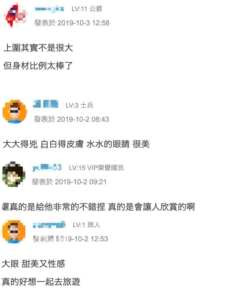除了傲人的上圍之外,有一張照片拍攝了她的背影,三角褲的造型勾勒出美臀的曲線,模特兒等級的長腿也令人相當驚艷,網友們也紛紛留言表示:「大大的胸,白白的皮膚 水水的眼睛,很美」、「還真的是給他非常的不錯捏 真的是會讓人欣賞的啊」、「大眼甜美又性感,真的好想一起去旅遊」、「身材比例太棒了」,火辣的好身材令網友們大飽眼福。