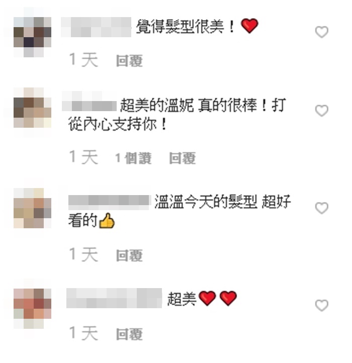 金鐘獎結束後,溫妮也在IG上表示,「又是一個不一樣的我!可能帶點一個沒被看懂的瀏海,不過我個人是非常滿意這次的造型!」然而溫妮也曬出自拍照片,露出自信滿滿的模樣,同時也引來不少粉絲稱讚給予支持,「覺得髮型很美」、「超美的溫妮」、「溫溫今天的髮型超好看!」。