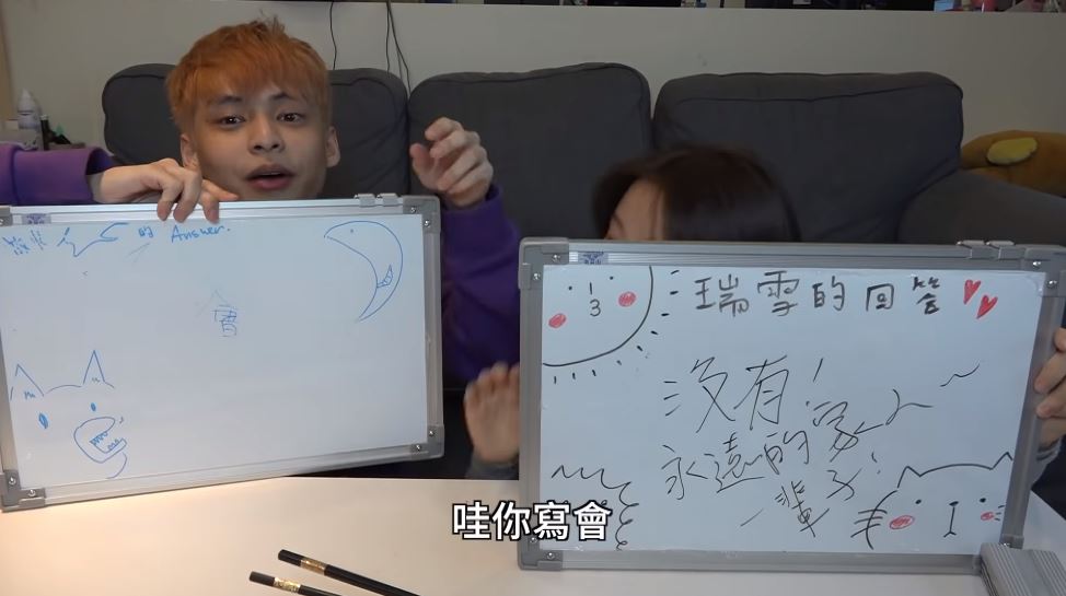 問題一出後,兩人同時掀開答案版,蔡瑞雪斬釘截鐵地表示「沒有」,認為放火只當兩人是一輩子的家人,但是放火的答案卻是「會」,讓氣氛一時陷入尷尬。而蔡瑞雪也忍不住再三確認「這是真實的想法嗎?」,並再三對放火強調,不能為了要懲罰自己,而故意捏造答案。讓放火只好承認「這是認真的!」,而他也解釋:「之前曾經有想過,但現在比較像家人」。