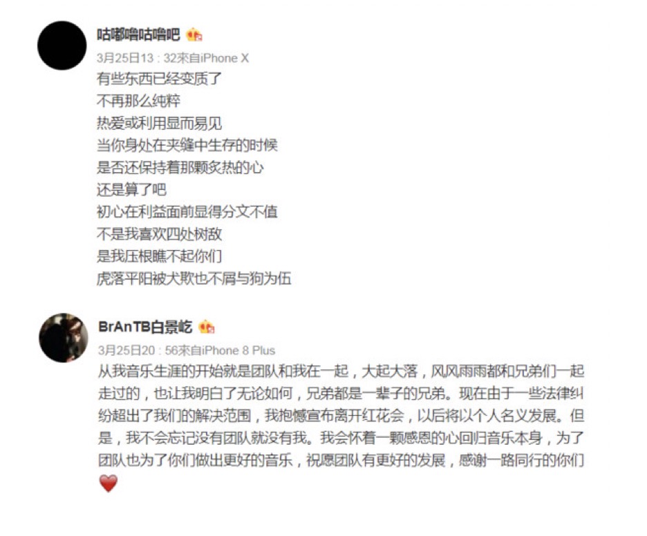 小白在2018年3月25號時發文宣布退出紅花會:「現在由於一些法律糾紛超出了我們解決的範圍,我抱撼宣布離開紅花會,以後將以個人名義發展」,而當天早前疑似PGONE的小號「咕嘟嚕咕嚕吧」發文抒發情緒,文末更寫道:「不是我喜歡四處樹敵,是我壓根瞧不起你們,虎落平陽被犬欺也不屑與狗為伍」,兩人同一天的發文也不免讓網友猜測是鬧不合。