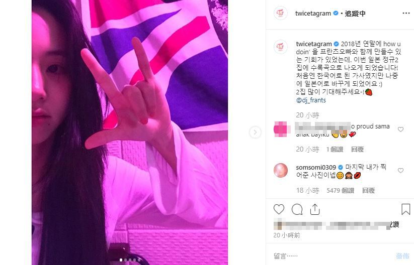 才結束今年第二次回歸,11月20日TWICE又將在日本發行第二張日文專輯《&TWICE》,昨(7)日已經釋出宣傳照和歌曲,而成員彩瑛也首度參與日文歌曲《How u doin’》創作,同時也是團中第一位參與詞曲的成員。而彩瑛也在IG透露該首歌曲原先是韓文版,由他和JYP製作人FRANTS於2018年底的共同創作,文末也可望外界多支持新作品。