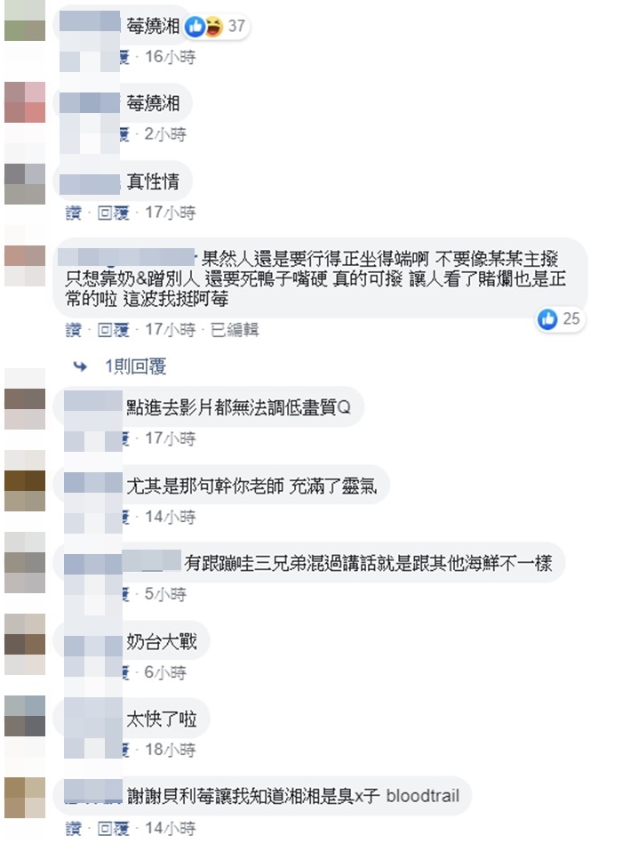 貝莉莓隔空開燒,也讓粉絲替她擔心會不會被其他女實況主討厭,對此貝莉莓更是火辣直言,「我跟她們感情好要幹嘛?我就不喜歡臭婊子啊」。甚至貝莉莓也小聲地說道,如果訂閱某些台的,可以把她的台退一退,她實在不想承認自己的觀眾有訂閱另一台的實況主!