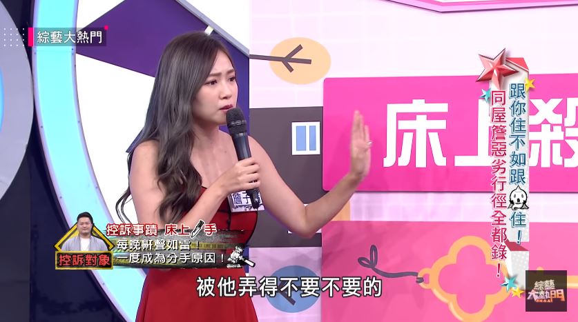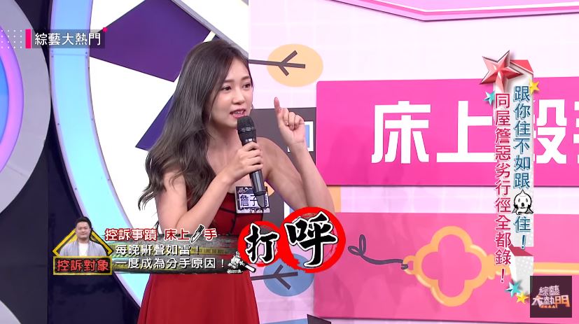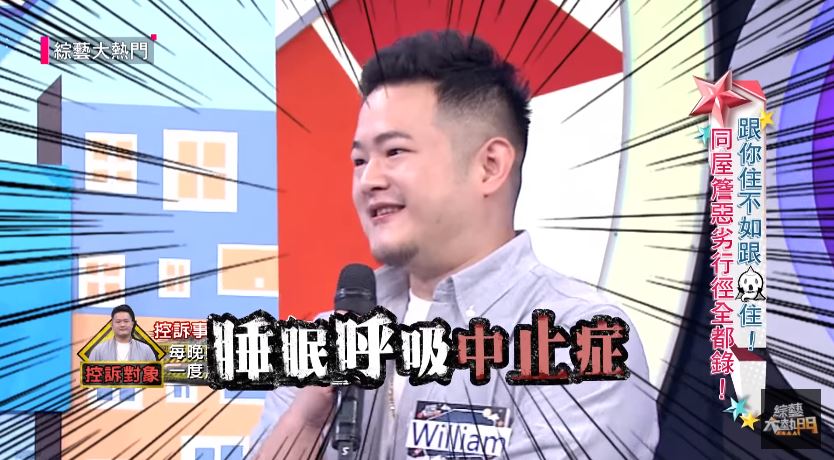 丫頭近來錄製《綜藝大熱門》,在節目中大爆3個和William同居的缺點。丫頭表示,之前偶爾一起過夜,還能忍受對方鼾聲如雷的問題,但自從兩人同居後,對方的鼾聲有時候讓她「真的很想一拳揍下去」,也因為William有「睡眠呼吸中止症」的問題,所以如果打呼聲突然中止,丫頭也會緊張到驚醒,自爆因為打呼問題「在床上被他弄得不要不要的」!